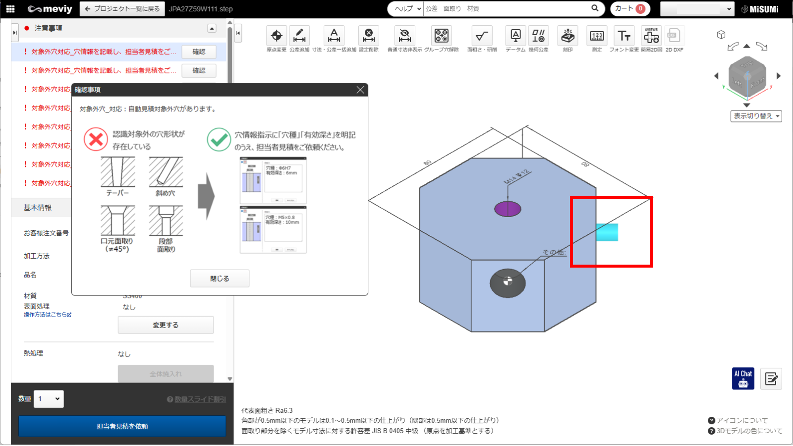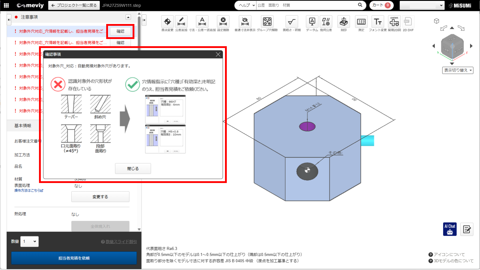 • ミラーパーツの設定(材質、寸法公差、穴種など)は変更できません。