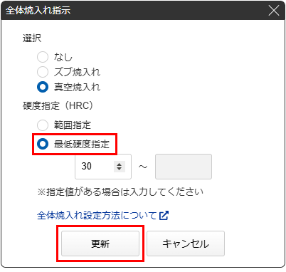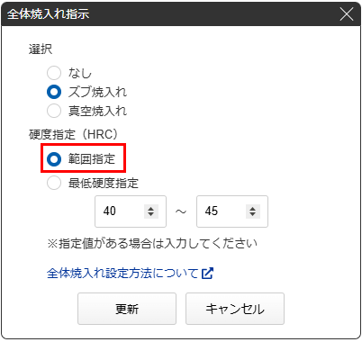 表示された[全体焼入れ指示]ダイアログの「選択」より焼入れの種類を指定すると「硬度指定 (HRC)」に標準の硬度が表示されます。標準硬度以外の硬度を指定されたい場合は「硬度指定 (HRC)」の入力欄に下限硬度~上限硬度を入力してください。最後に「更新」ボタンをクリックします。