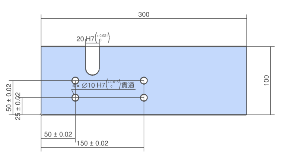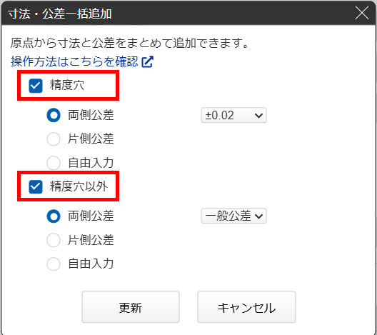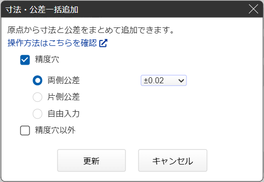 精度穴のみにチェックを入れると、原点から精度穴だけに寸法および寸法公差がまとめて追加されます。