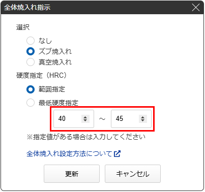 「最低硬度指定」は、希望する硬度(HRC)の最低値のみを記入することで設定が完了します。