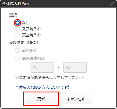 - 表示された[全体焼入れ指示]ダイアログの「選択」より焼入れの種類を指定すると「硬度指定 (HRC)」に標準の硬度が表示されます。