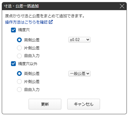• 設定した原点から穴に対して、寸法および寸法公差をまとめて追加できるようになりました。
