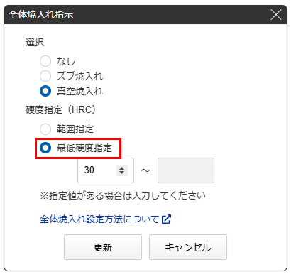切削角物で熱処理を設定する際に、最低硬度を指定できるようになりました。