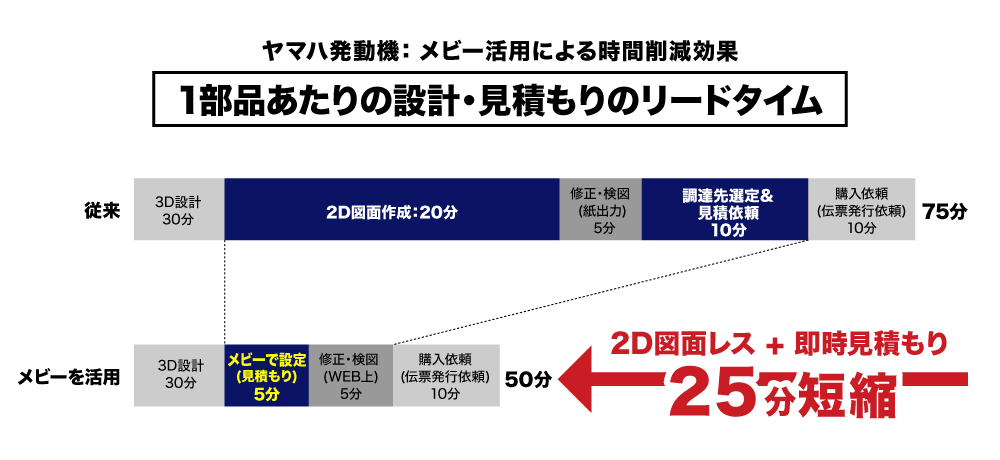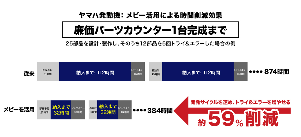 メビーを活用することで、作図・見積もりの手間や納入までの待ち時間が大幅に短縮される。従来の部品手配方法では限られた時間で5回しかトライ&エラーできないところを、メビーを活用すれば10回以上トライできる。部分的な時短のみならず開発サイクルが圧倒的に速くなったと、メビーを活用するメリットを実感しているという。