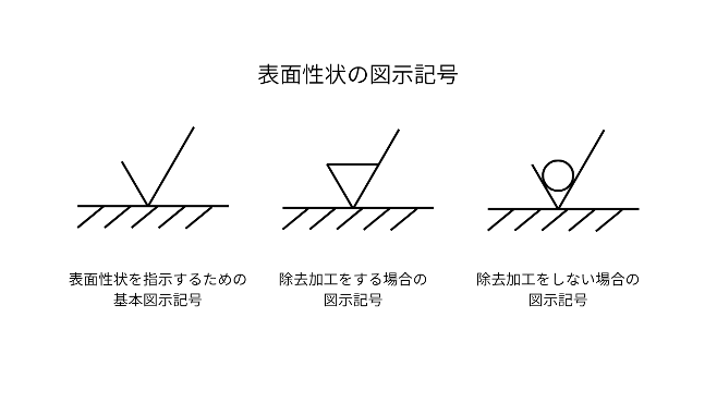 表面粗さの指示では、除去加工の要否によって記号の形状を使い分ける必要があります。形状ひとつで「削るべきか、素材のまま残すべきか」という加工指示が決定づけられます。