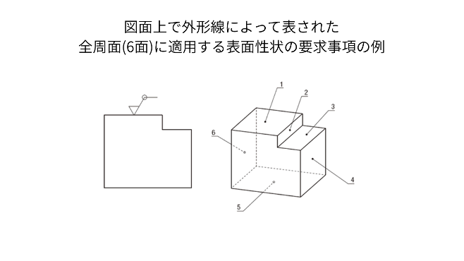 図面上で全周記号を付けた場合は、その指示が特定の一面だけでなく、対象形状を構成するすべての周囲面に適用されます。例えば角柱形状であれば、図のように6面すべてに同一の表面性状要求を指示する意味となります。部分的な面だけに適用したい場合は全周記号を用いず、対象面を個別に指定する必要があります。