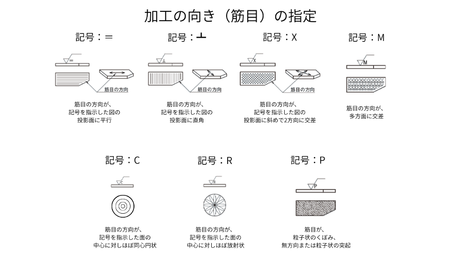 部品の機能性を引き出すためには、記号の右下に補助記号を添えて「加工の向き(筋目)」を指定することが重要です。軸の回転方向やシールの摺動方向に対して加工目がどう付くかは、摩擦抵抗や気密性に直接的な影響を及ぼします。