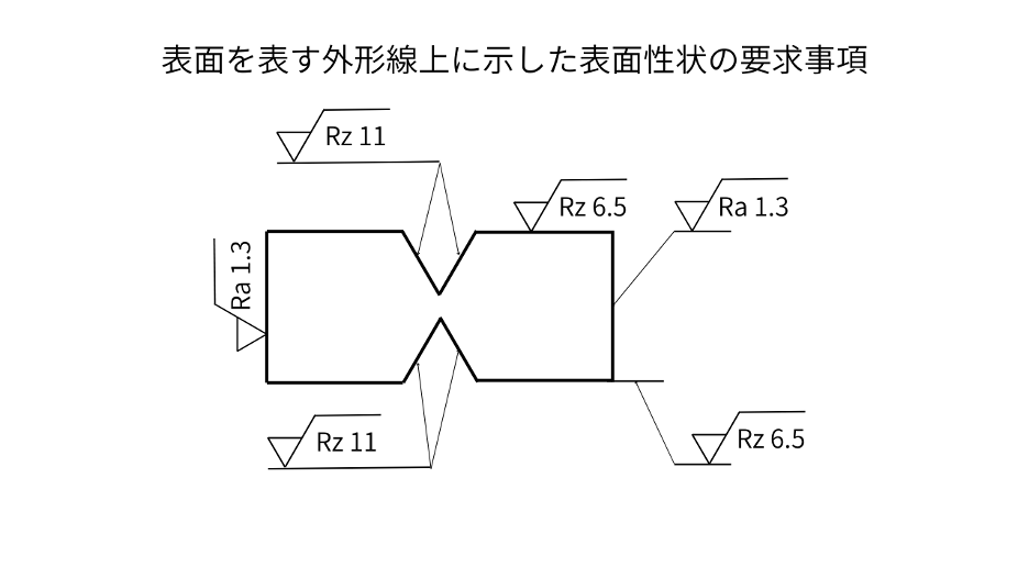 図面上にある「RzJIS」は、旧JIS規格との混同を避けるための表記で、現在のRzとは定義が異なります。現在のRzは「最大高さ」ですが、旧規格におけるRzは「十点平均粗さ(高い山5つと深い谷5つの平均)」と定義されていました。