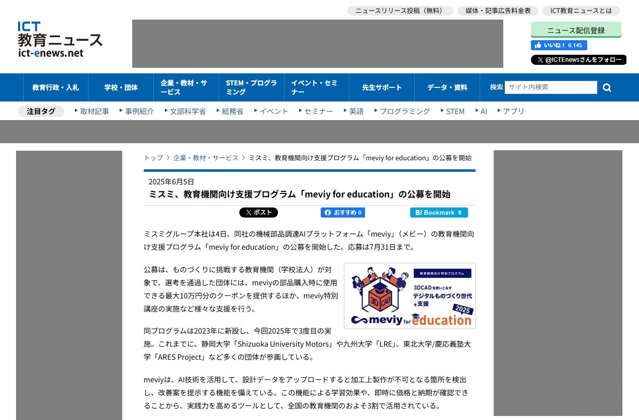 ミスミ、機械部品調達AIプラットフォーム「meviy」の教育機関向け支援プログラムの公募開始|「ICT教育ニュース」にてmeviyを紹介していただきました