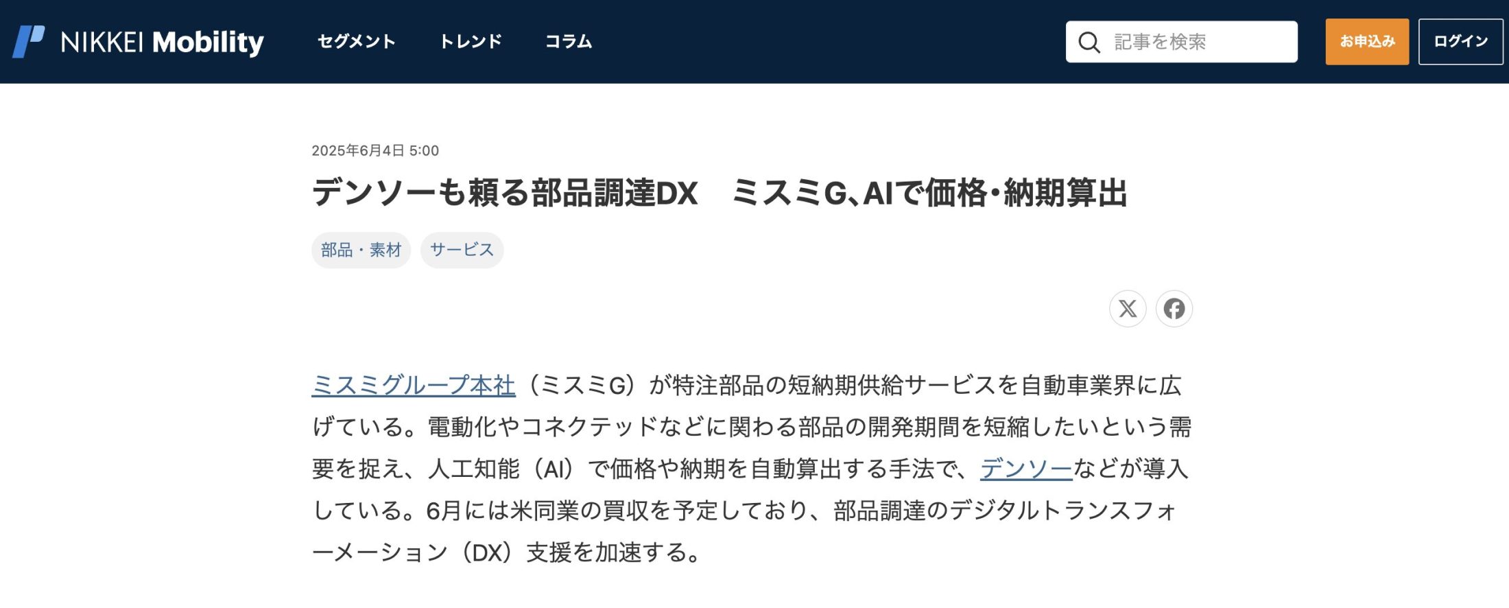 デンソーも頼る部品調達DX ミスミG、AIで価格・納期算出|「日経モビリティ」にて掲載