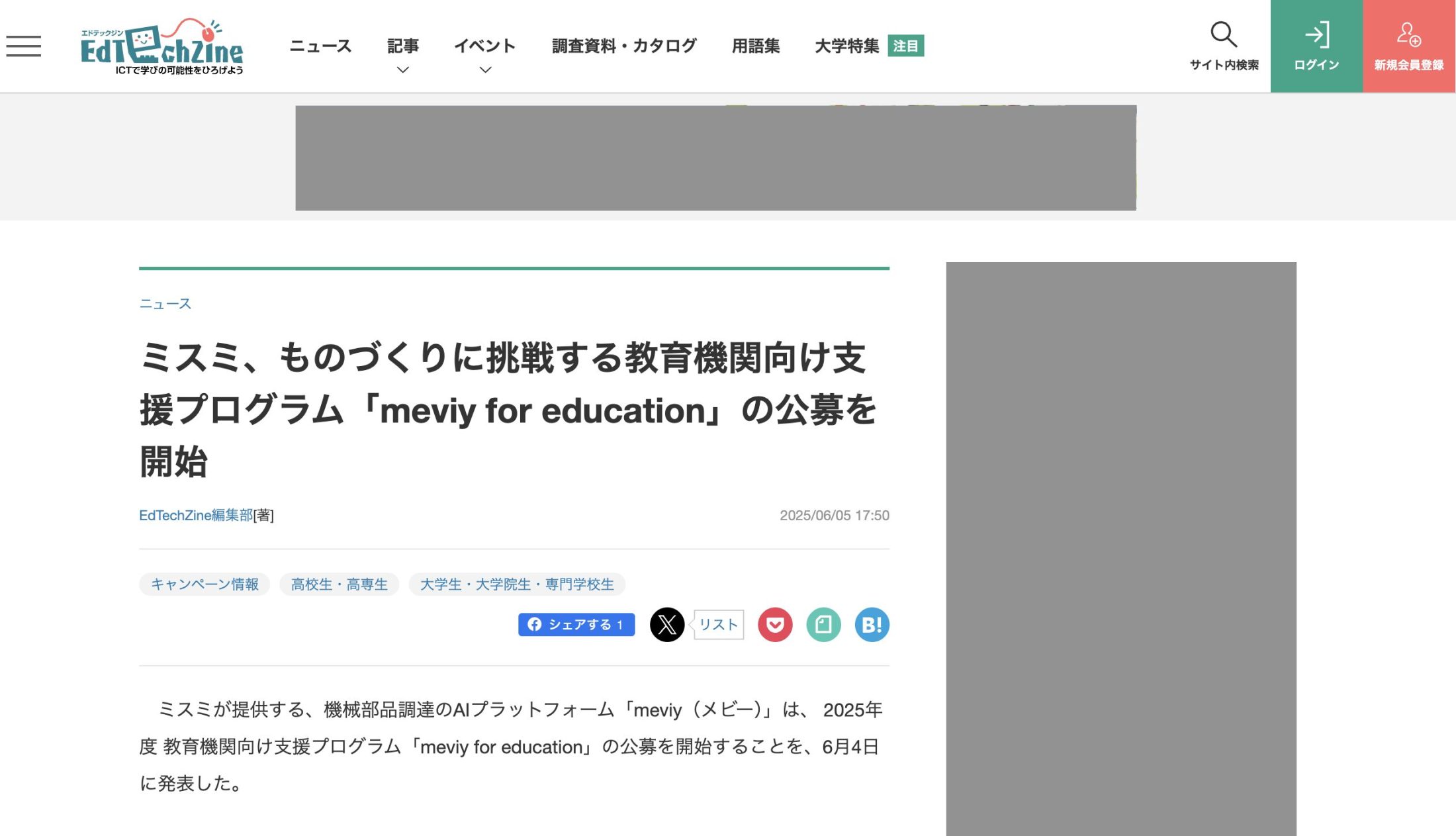 『ミスミ、ものづくりに挑戦する教育機関向け支援プログラム「meviy for education」の公募を開始』と題して、掲載していただきました。