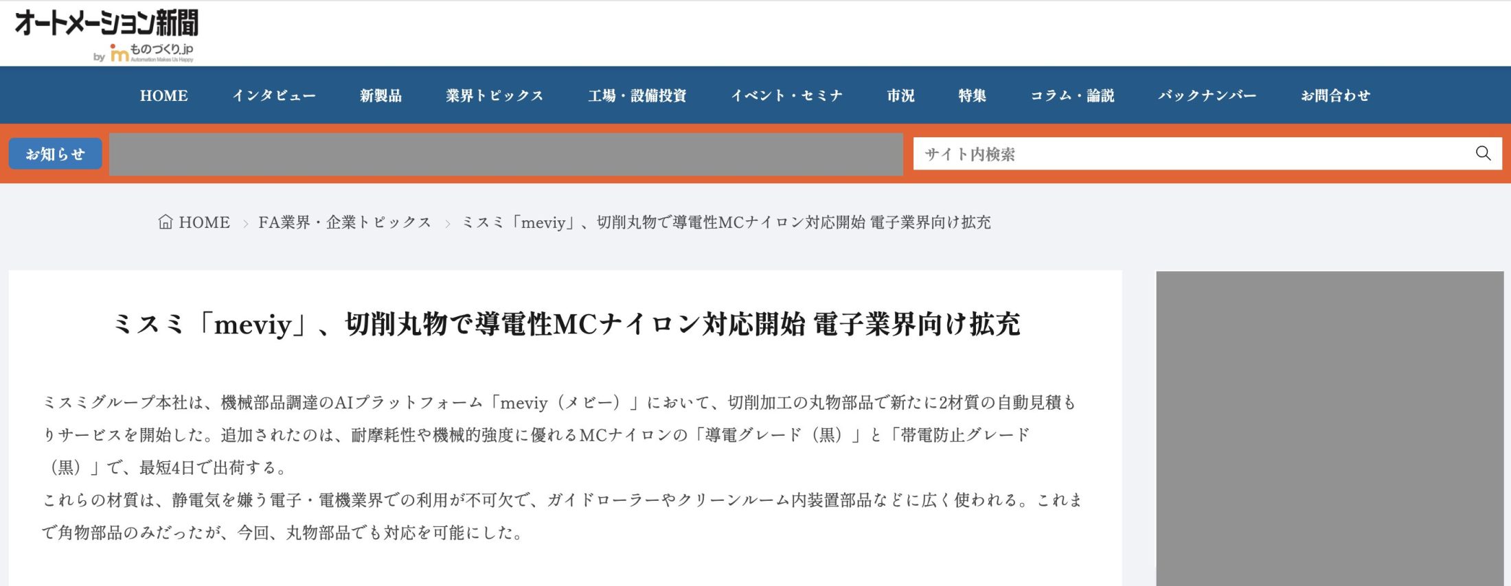 『ミスミ「meviy」、切削丸物で導電性MCナイロン対応開始 電子業界向け拡充』と題してmeviyを取り上げていただきました。