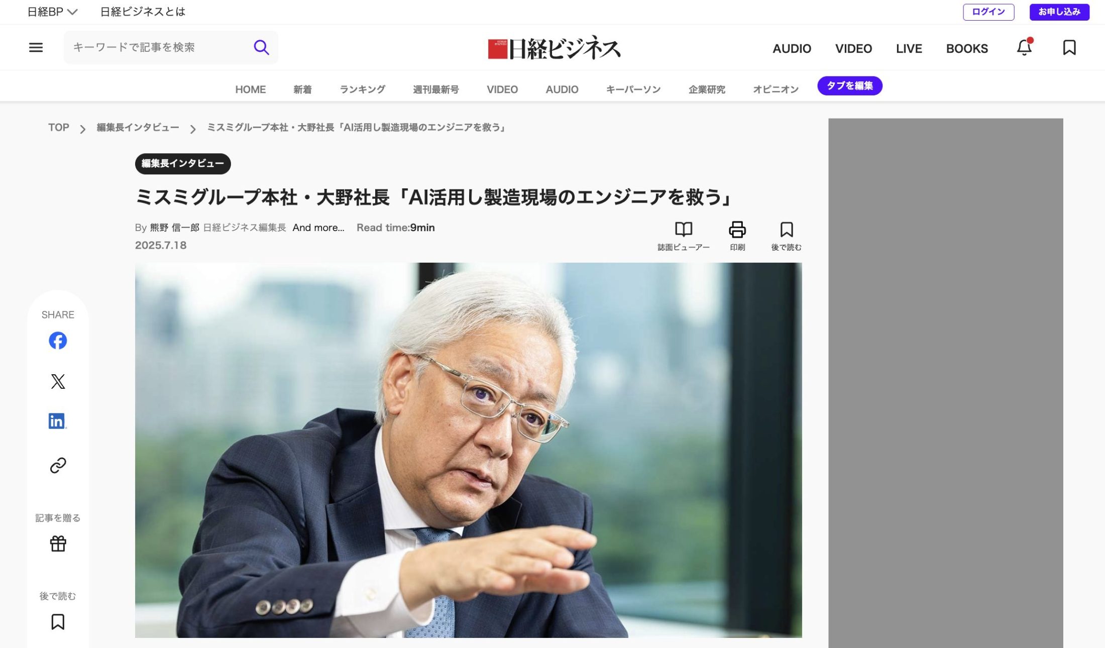 ミスミグループ本社・大野社長「AI活用し製造現場のエンジニアを救う」|「日経ビジネス」にて掲載
