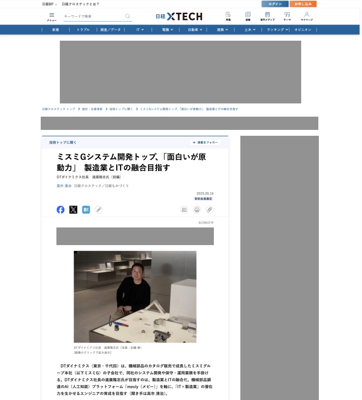 『ミスミGシステム開発トップ、「面白いが原動力」 製造業とITの融合目指す』と題して、日経クロステックにDTダイナミクス社長の道廣隆志氏のインタビュー記事が掲載となりました。