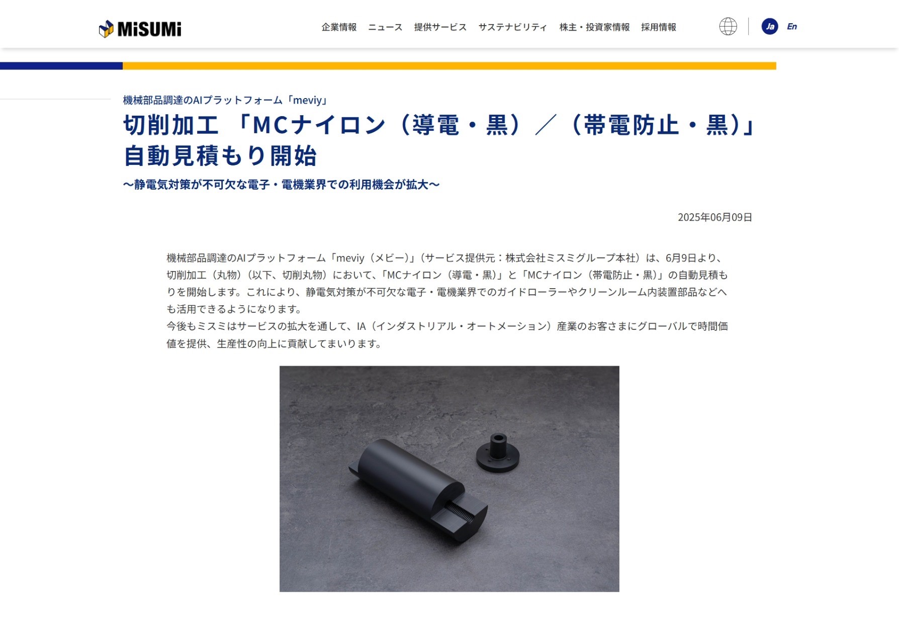 機械部品調達のAIプラットフォーム「meviy(メビー)」(サービス提供元:株式会社ミスミグループ本社)は、6月9日より、切削加工(丸物)(以下、切削丸物)において、「MCナイロン(導電・黒)」と「MCナイロン(帯電防止・黒)」の自動見積もりを開始します。