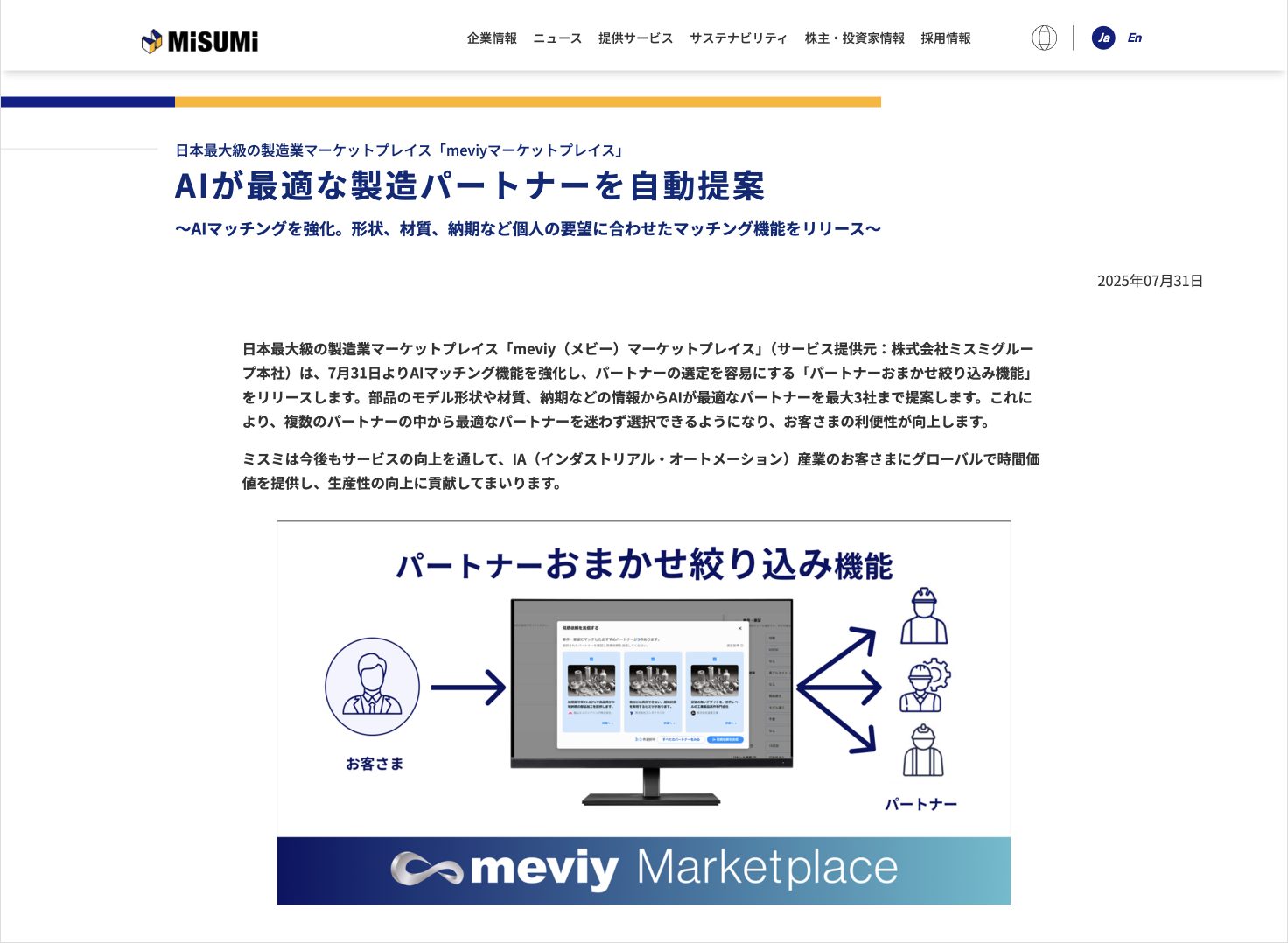 日本最大級の製造業マーケットプレイス「meviy(メビー)マーケットプレイス」(サービス提供元:株式会社ミスミグループ本社)は、7月31日よりAIマッチング機能を強化し、パートナーの選定を容易にする「パートナーおまかせ絞り込み機能」をリリースします。