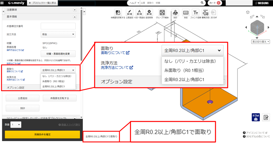 面取り「全周R0.2以上/角部C1」を選択すると、3Dビューワー左下に選択中の面取り指示が表示されます。
